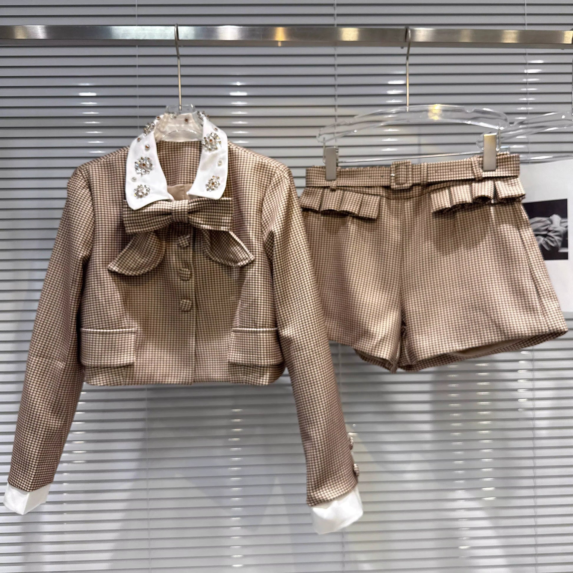 Make a statement with this show-stopping two-piece set! Featuring a plaid short jacket with a glamorous sequined collar and coordinating bow necktie detail, this outfit screams confidence and style. The matching shorts complete the look perfectly for anyone ready to own the room. Whether you're heading to a night out or turning heads at an event, this bold ensemble delivers instant boss energy with a touch of sparkle. Dress it up or down—this versatile set is your secret weapon for looking absolutely fabulous.