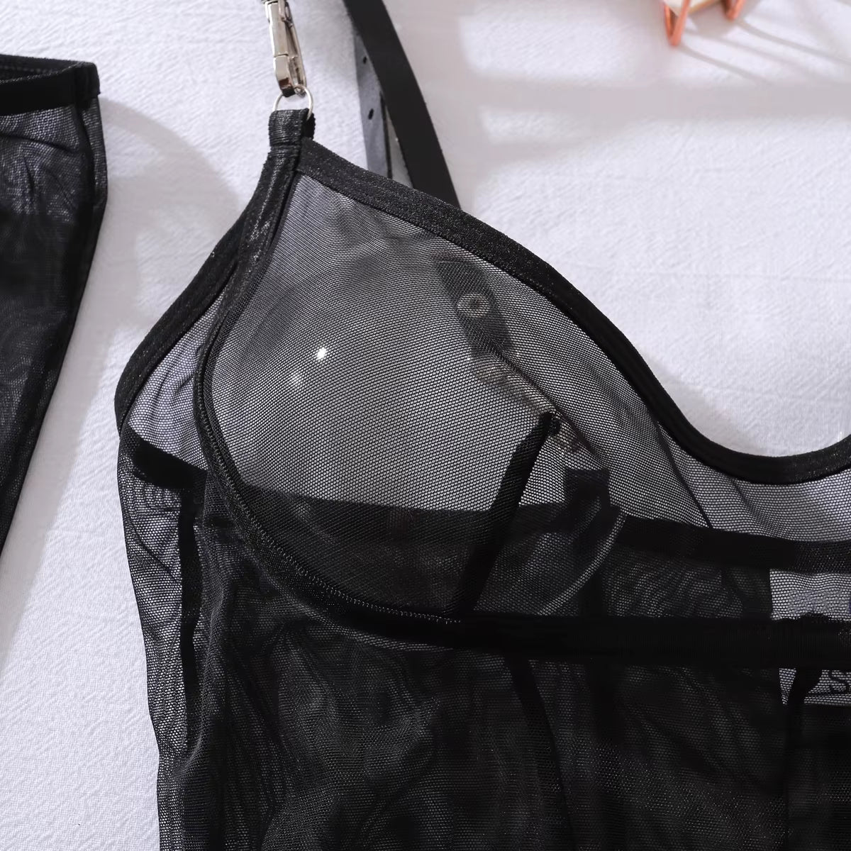 Unleash your inner confidence with this daring two-piece lingerie set designed for those who love to make a statement. Featuring a sheer see-through dress paired with a matching thong, this ensemble combines sultry elegance with bold attitude. The set includes coordinating gloves and an eye-catching PU leg harness adorned with metal fasteners for that extra edge. Perfect for special occasions, intimate moments, or anyone ready to embrace their playful side. This party-ready kit delivers maximum impact with minimal coverage—because sometimes less really is more.