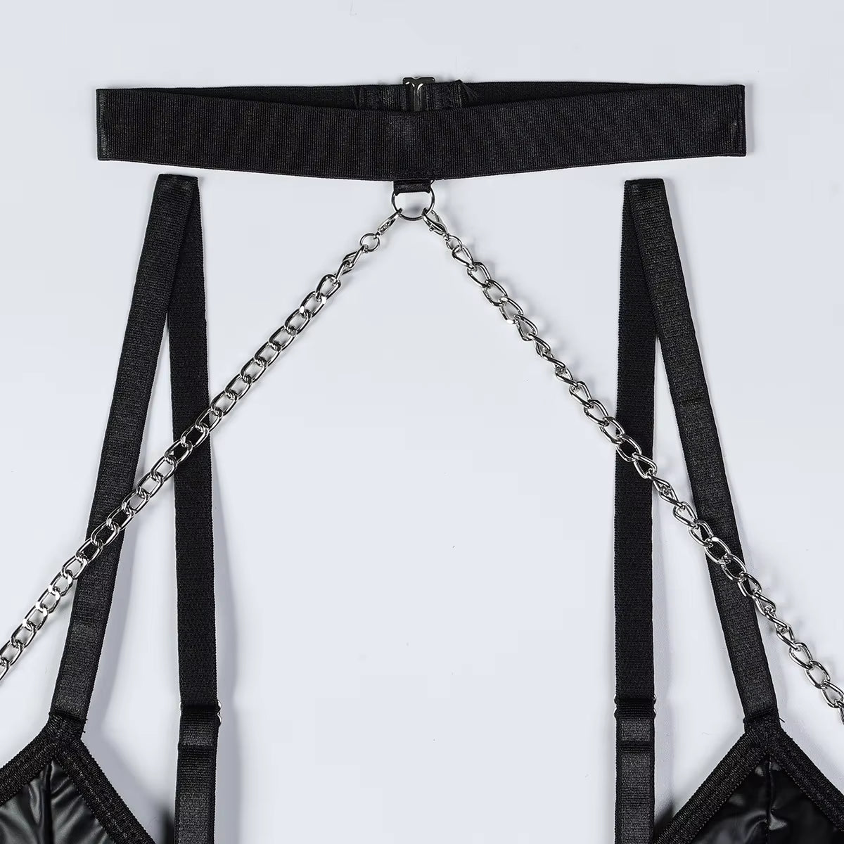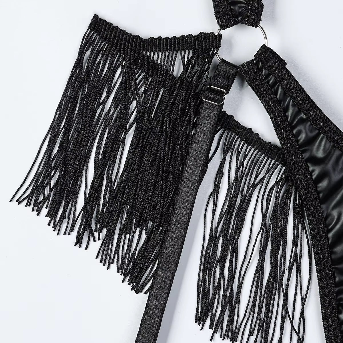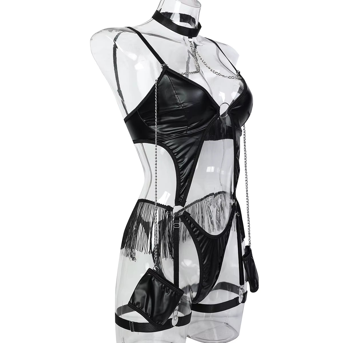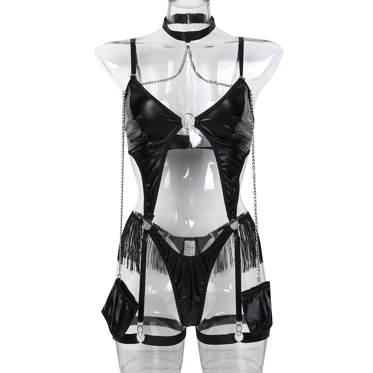 Turn up the heat with Lingerie Estefanía, a daring bodysuit designed for bold moments. Crafted from seductive PU material, it features playful tassels and a halter chain that hugs your curves, while the hollow belly design adds a tantalizing touch. Perfect for adventurous evenings, this sensual kit invites you to explore your fantasies with a flirtatious edge.