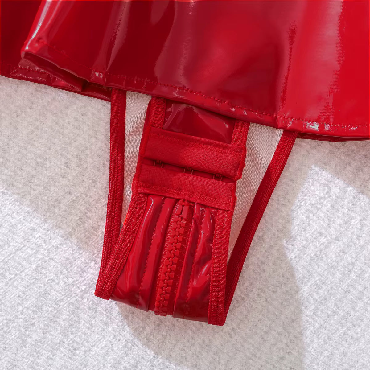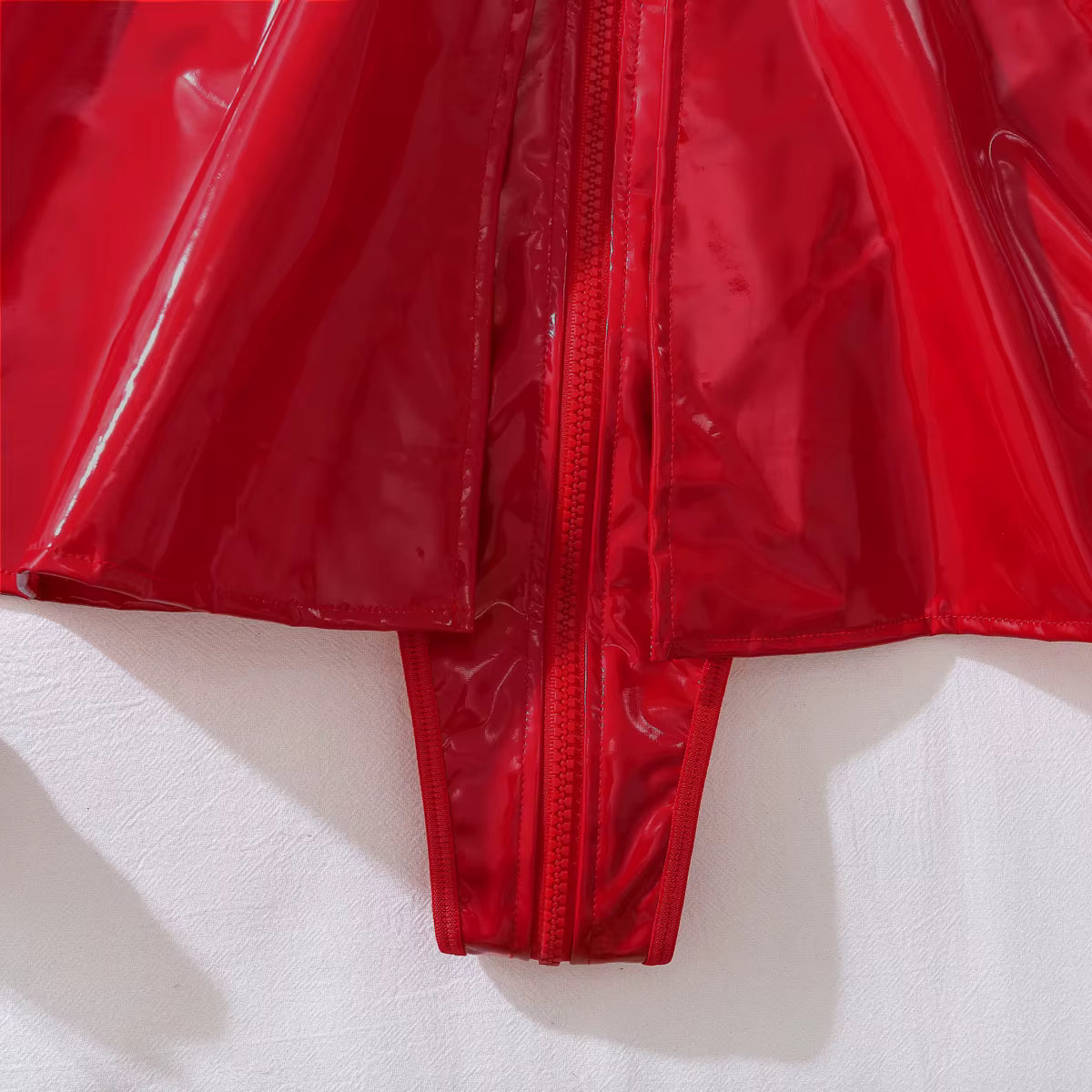 Turn up the heat with Lingerie Felizia, designed to captivate and thrill. This seductive mini bodycon features a playful V-neck and daring open crotch, crafted from sheer PU with a bold zipper detail. Perfect for wild nights or clubwear, its latex-like shine adds an irresistible edge to your look. Embrace your adventurous side and let Felizia be your secret weapon of seduction.