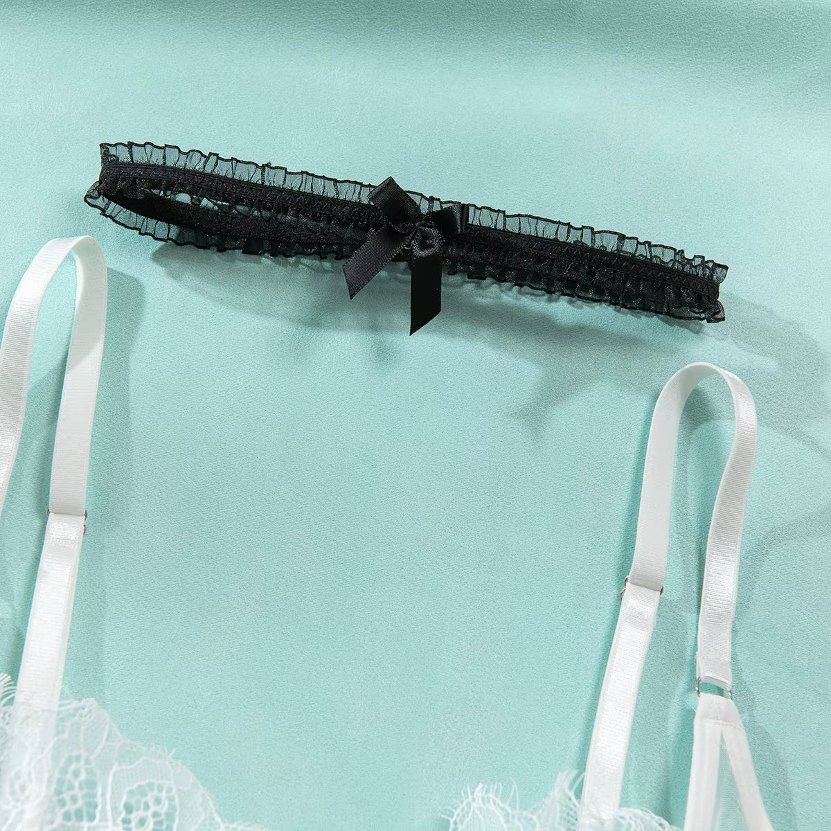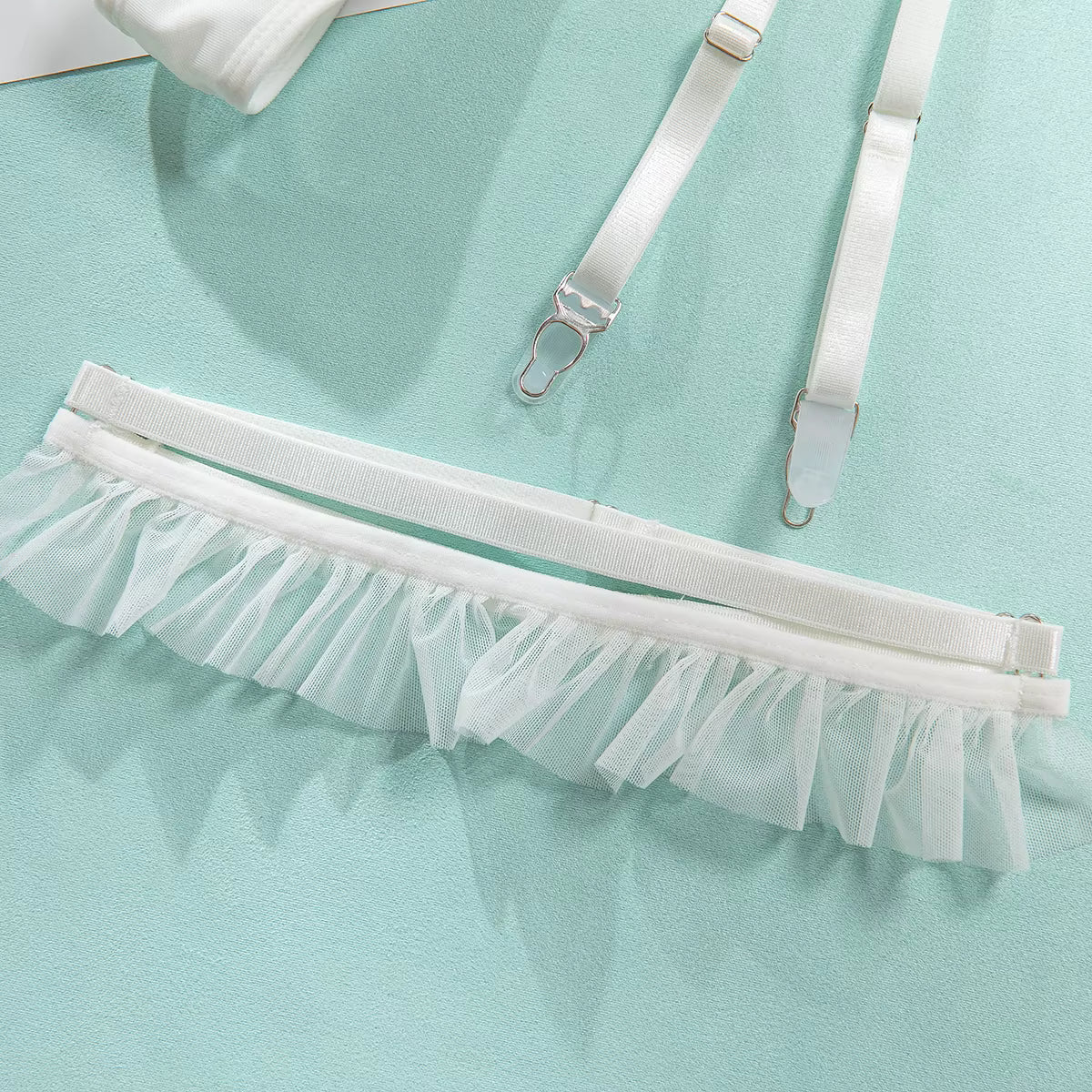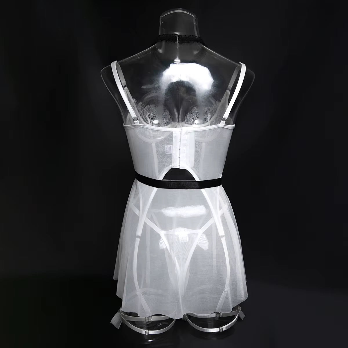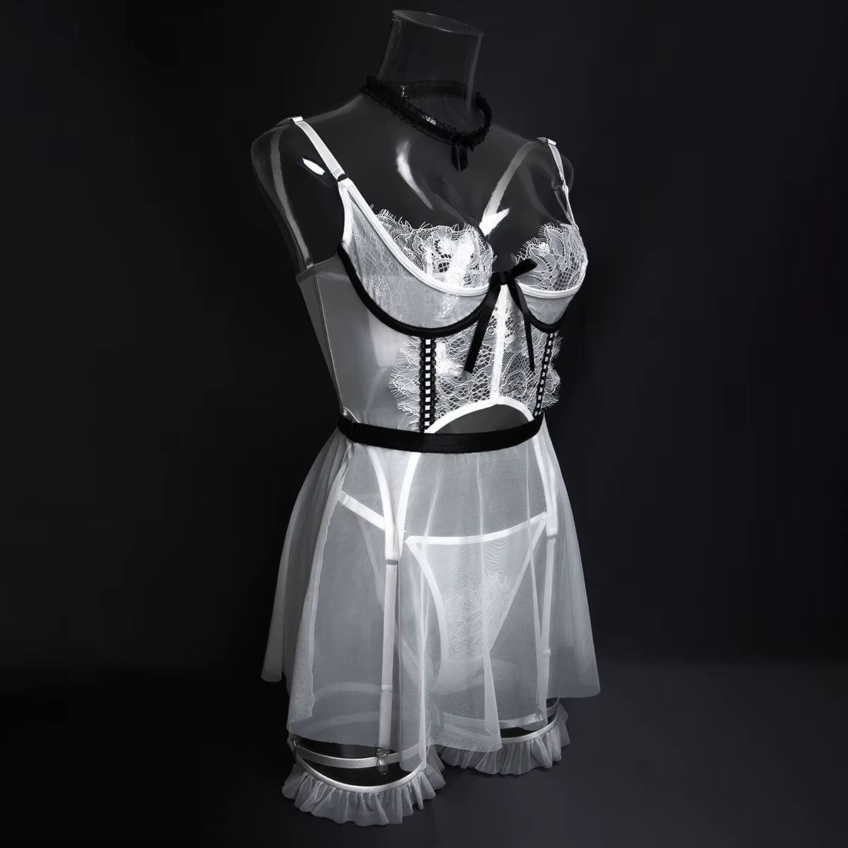 Turn up the heat with the Lingerie Fidelia set, featuring a sheer tulle skirt and lace corset designed to ignite pure desire. This 4-piece ensemble includes leg circles that add a teasing, delicate touch, perfect for playful, intimate moments. Its transparent, hollow lace details create an irresistible silhouette that celebrates sensuality and confidence.