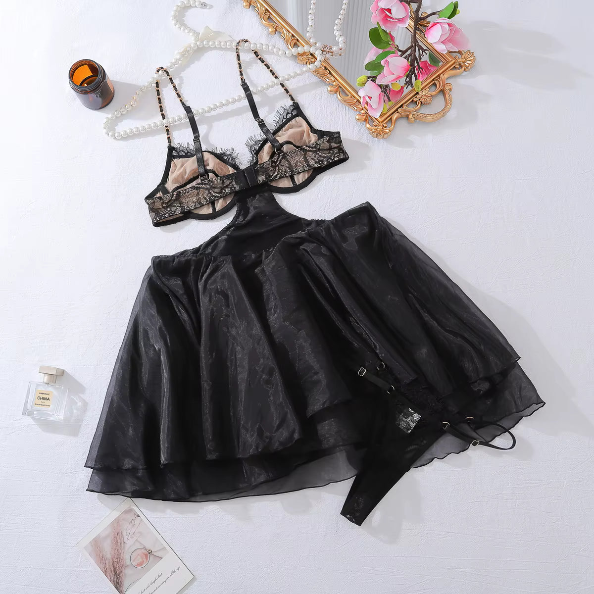 Add a flirty twist to your wardrobe with the Lingerie Matea set. Featuring delicate chain shoulder straps and a daring backless design, this playful outfit highlights fancy cut-out details at the sides. The soft organza tutu adds a whimsical touch, making it perfect for turning heads and feeling fabulous. Embrace your bold, fun side with this unique blend of lingerie and fashion flair.