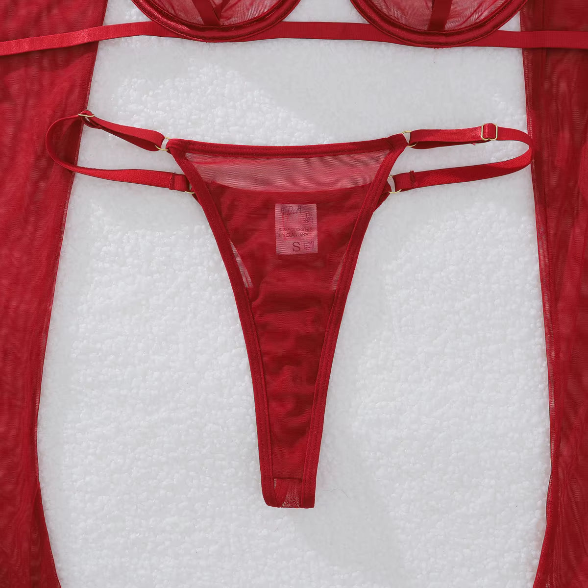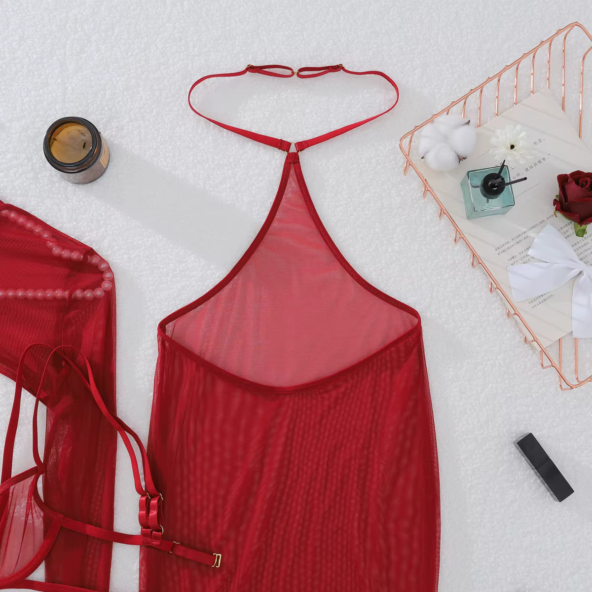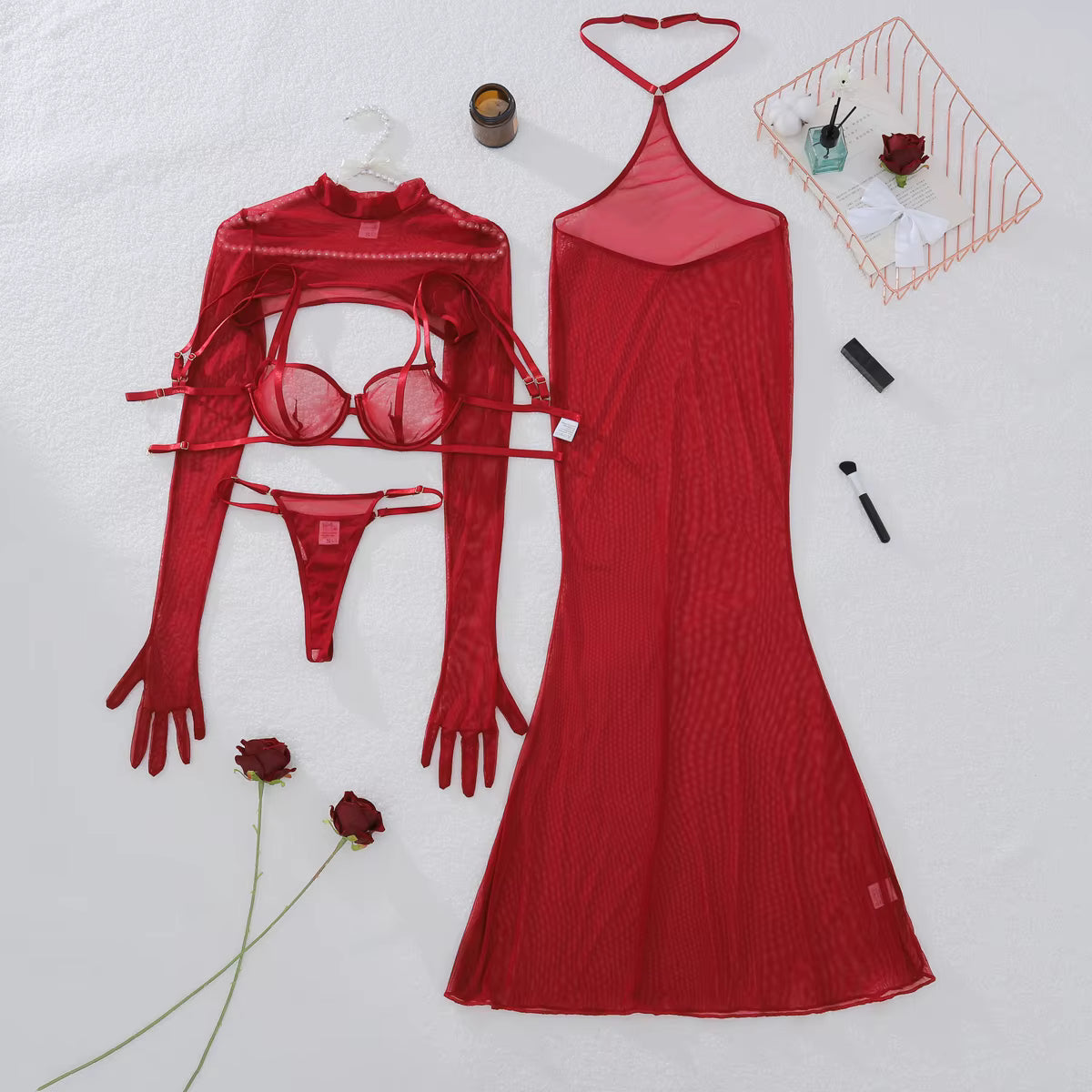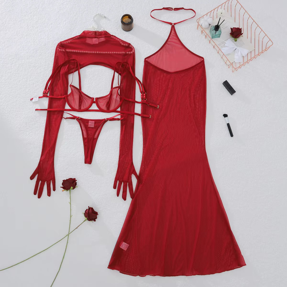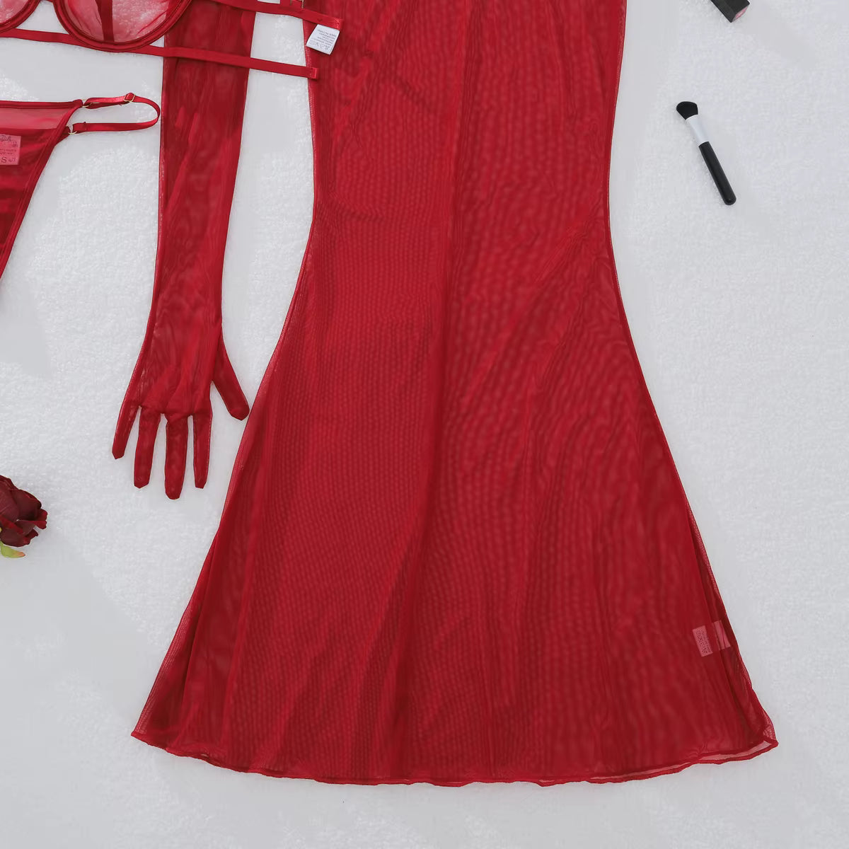 Be a true lingerie princess with our elegant and sexy 4PC mermaid set. This willowy, see-through ensemble includes a backless long dress, gloves, crop top, and wine party accessories. Perfect for unleashing your inner seductress.