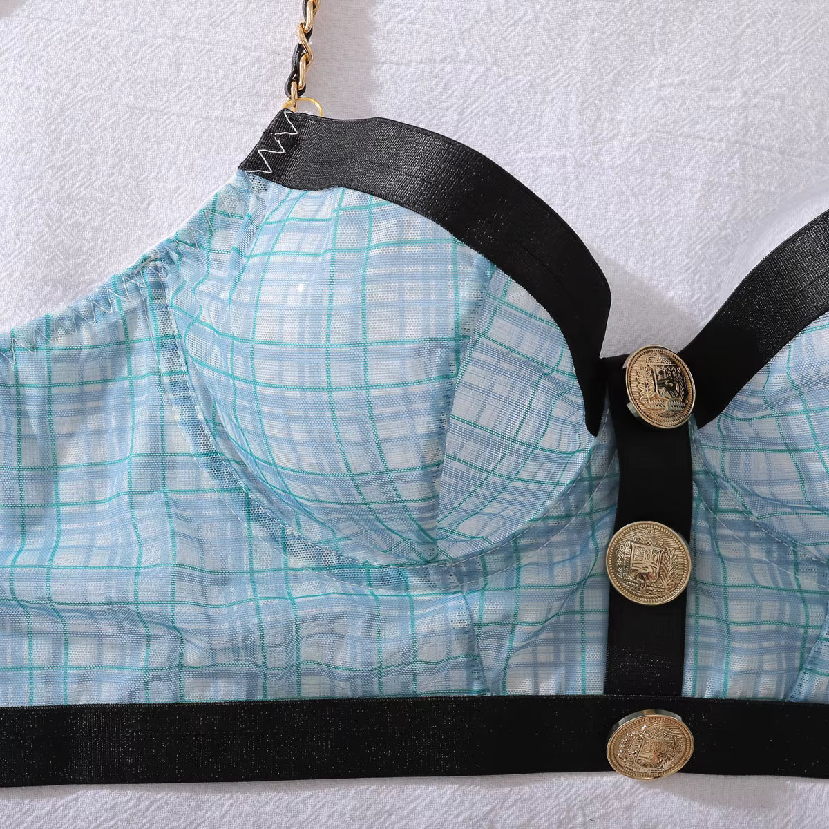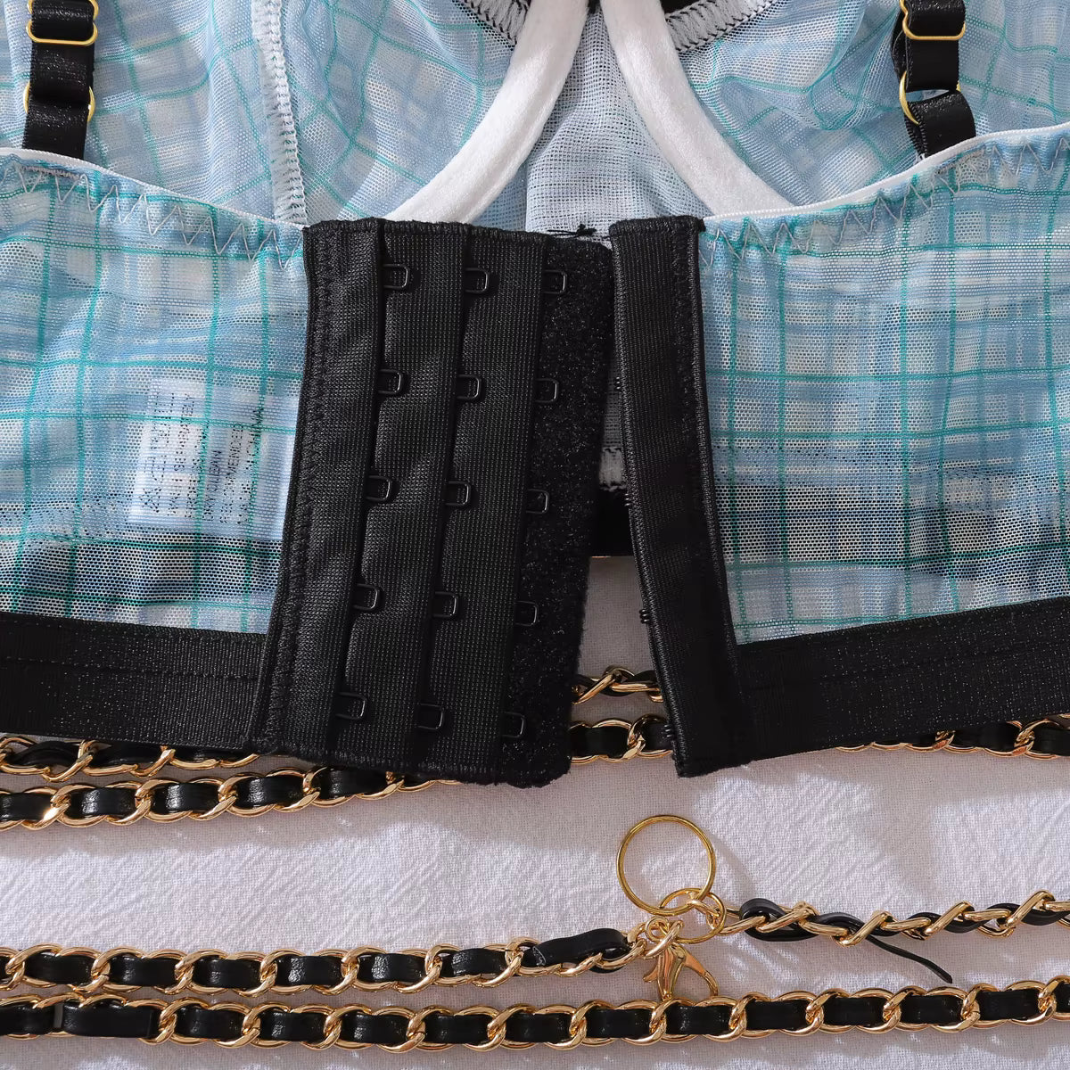 Indulge in the allure of Lingerie Samantha. This elegant two-piece set features chic contrast colors and a unique retro design. With a sexy bustier and matching panty, this lingerie set is perfect for any woman looking to make a statement. Complete with a chain accent, it's sure to add some extra spice to your underwear collection.