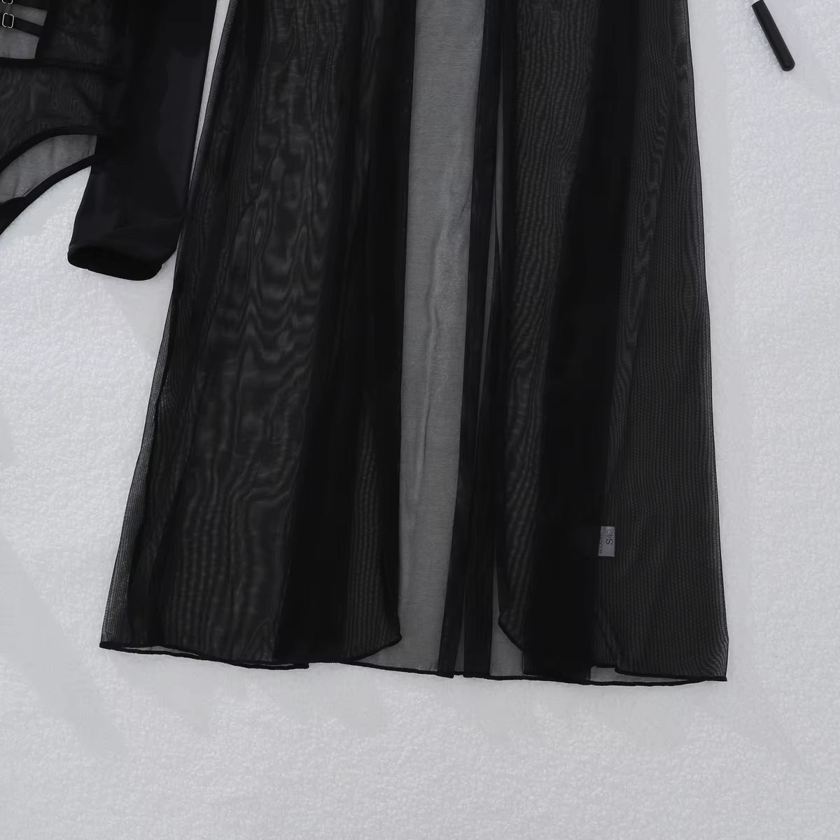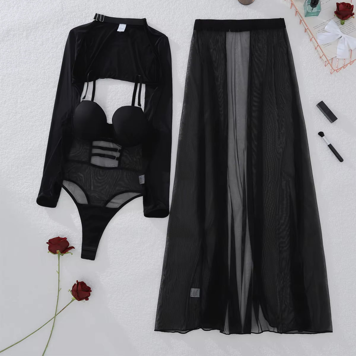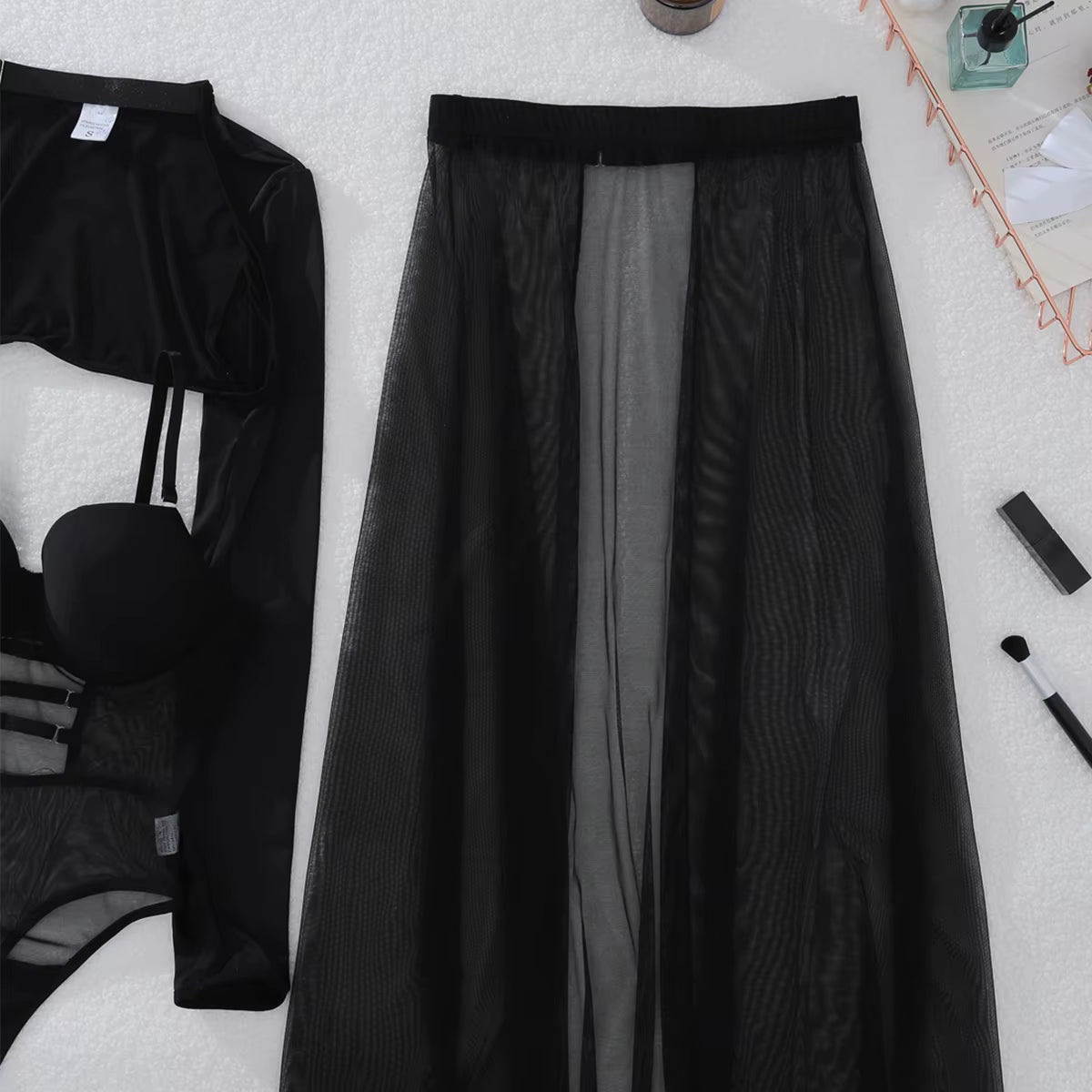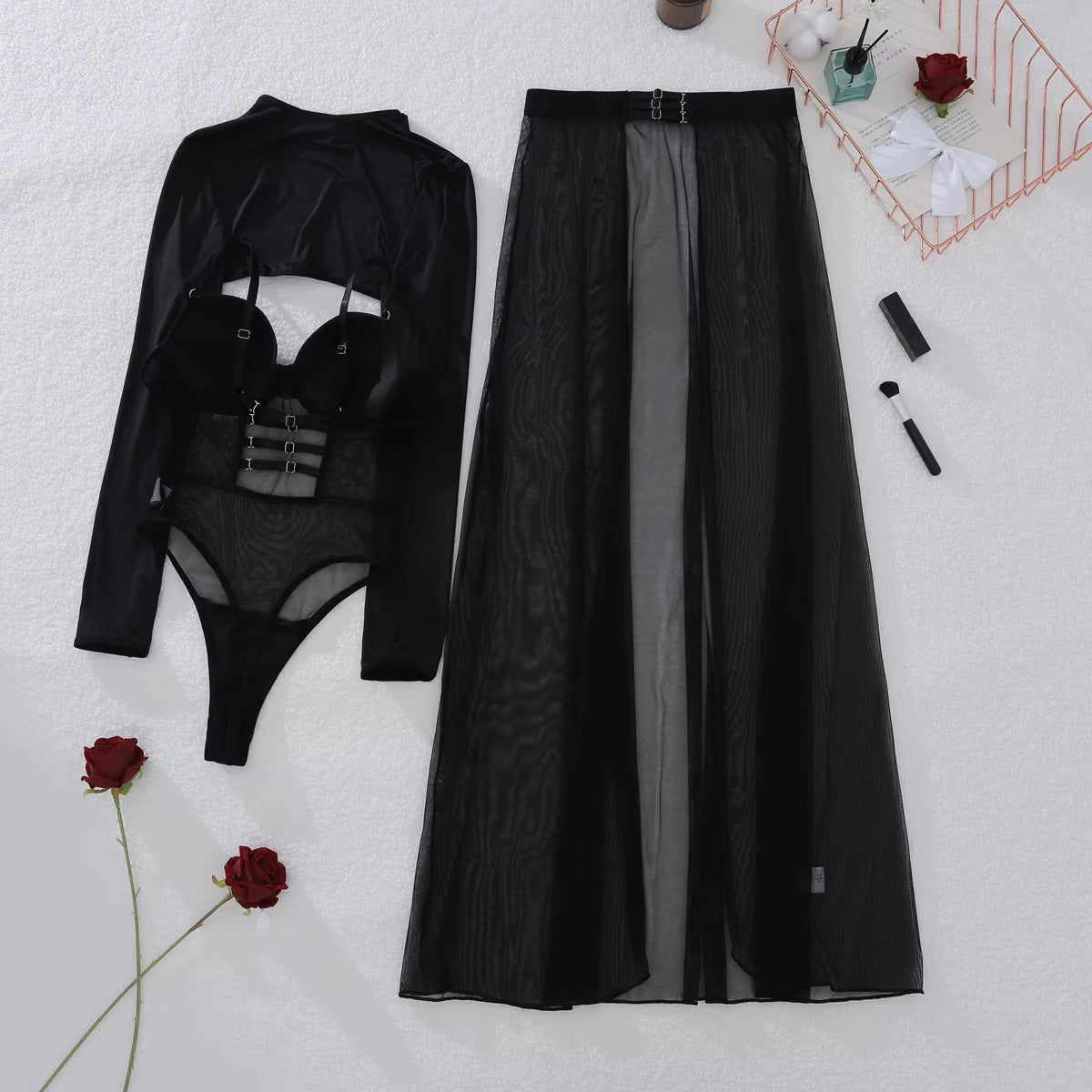 Unleash your playful side with this sensual 3PC set. Featuring an elegant long sleeve crop top and skirt bodysuit, this lingerie set is perfect for a sultry night out. The mesh split detail adds a touch of seduction, making you feel confident and sexy. (Don't tell your grandma about this one!)