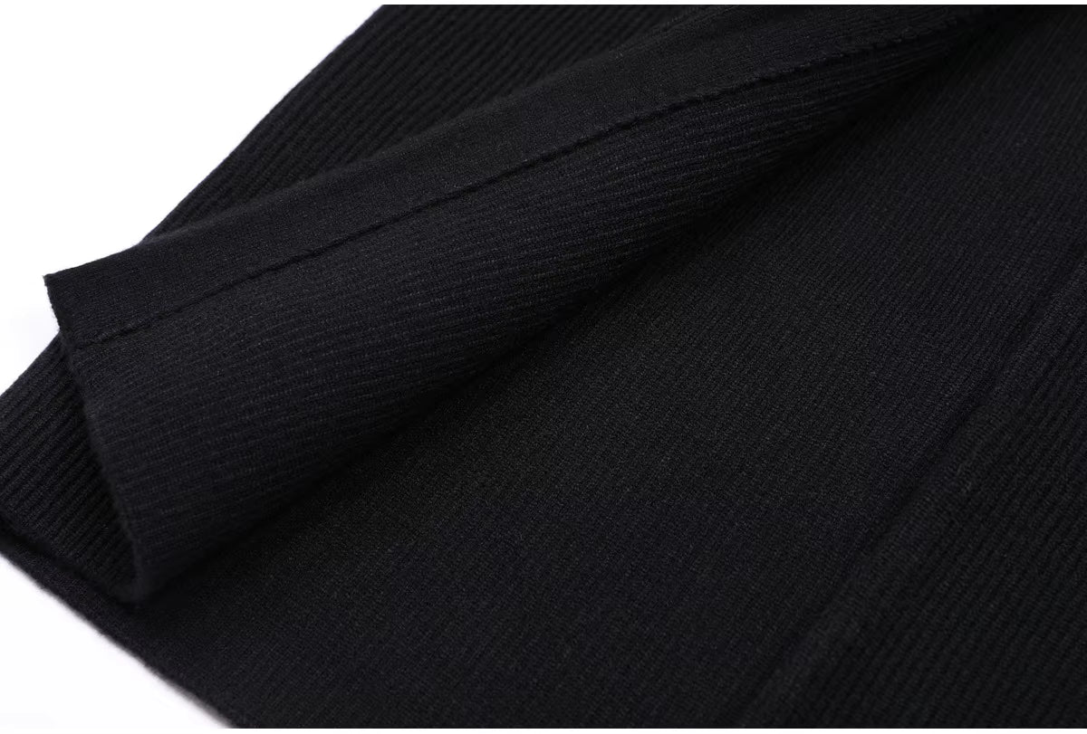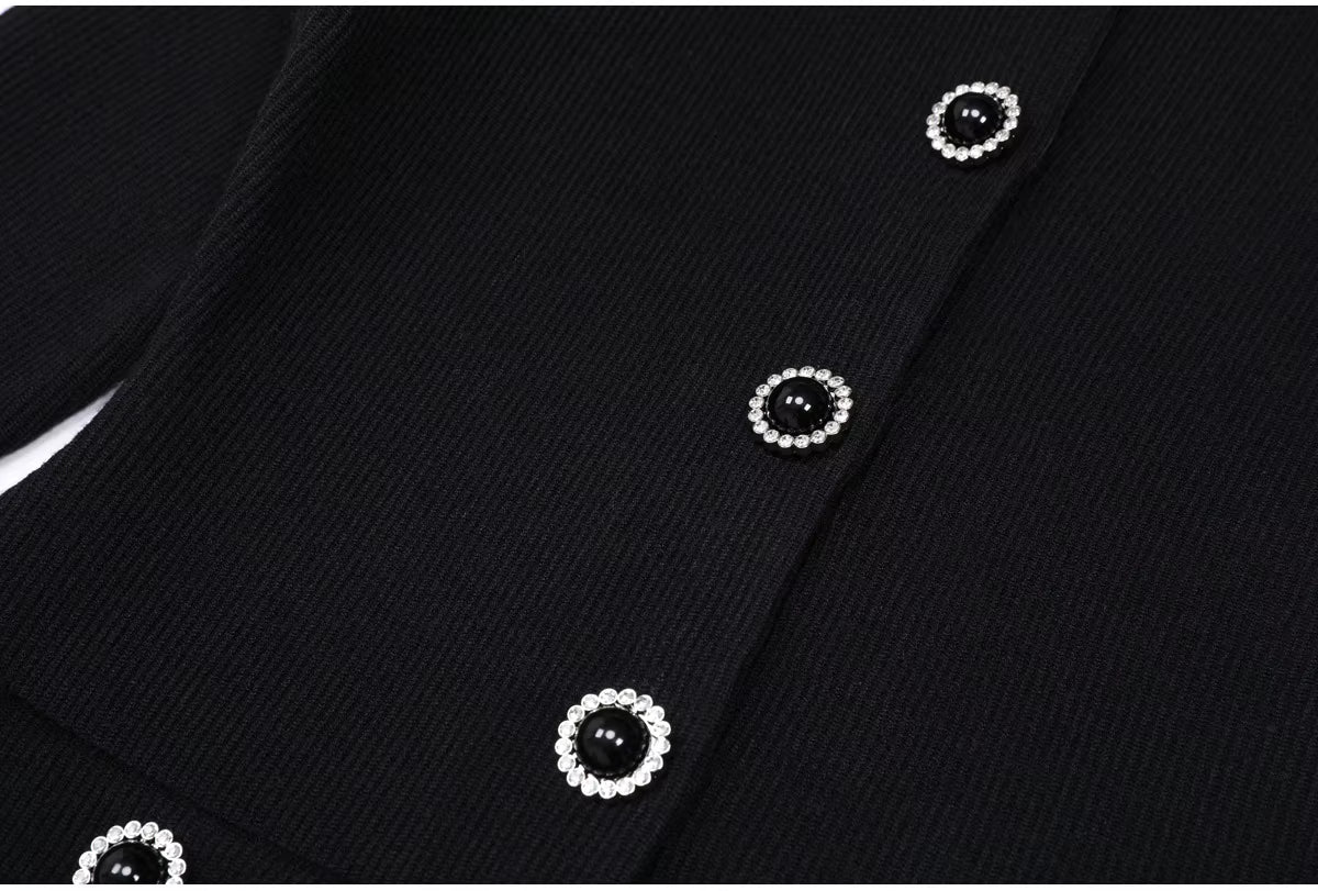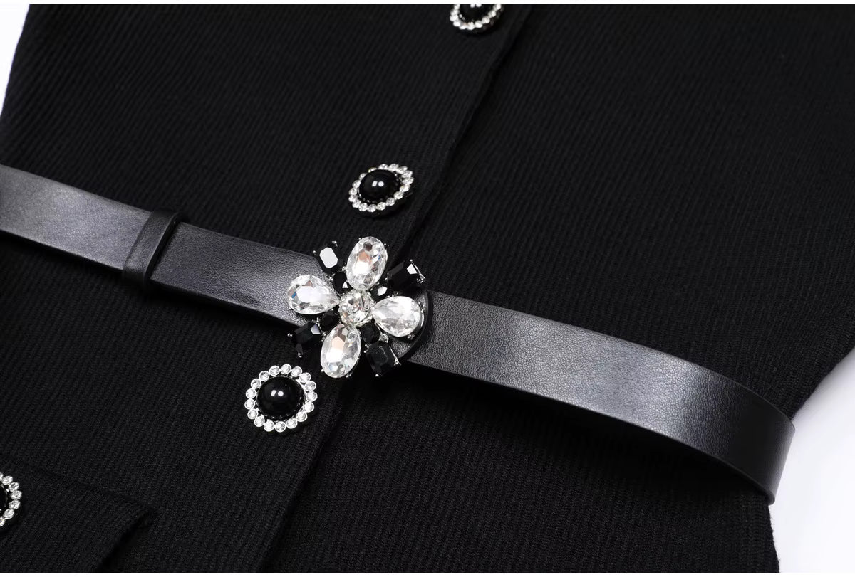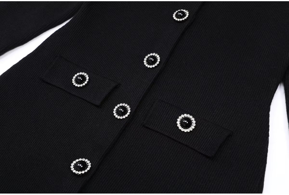 Elegant knitted long sweater dress for women featuring beading, belt, slit and single-breasted design. Warm, slim fit winter dress with full sleeves.