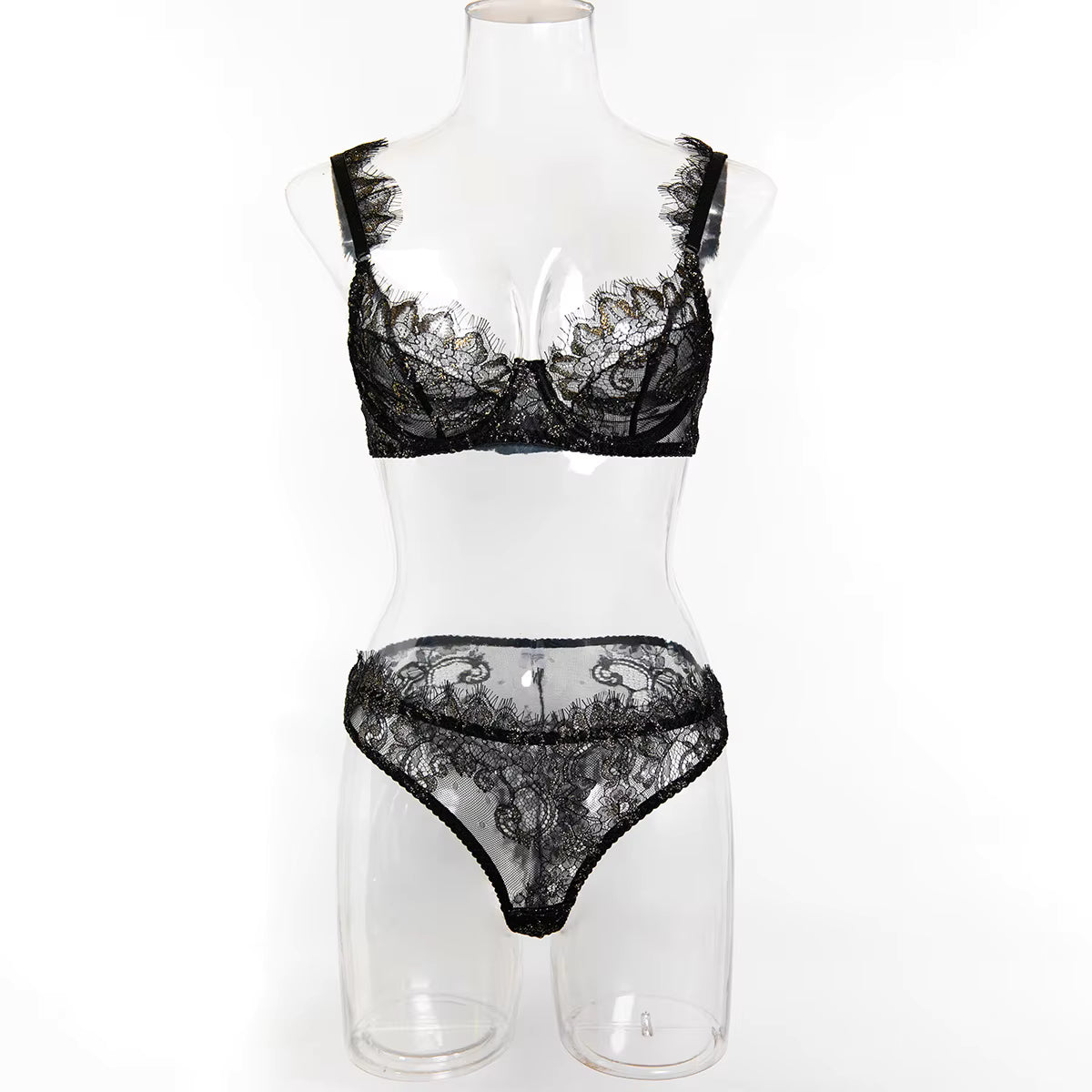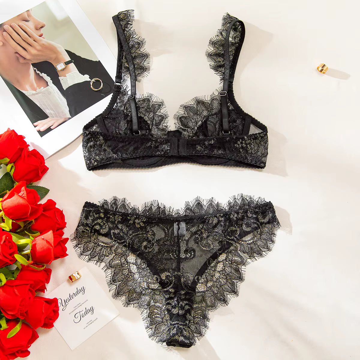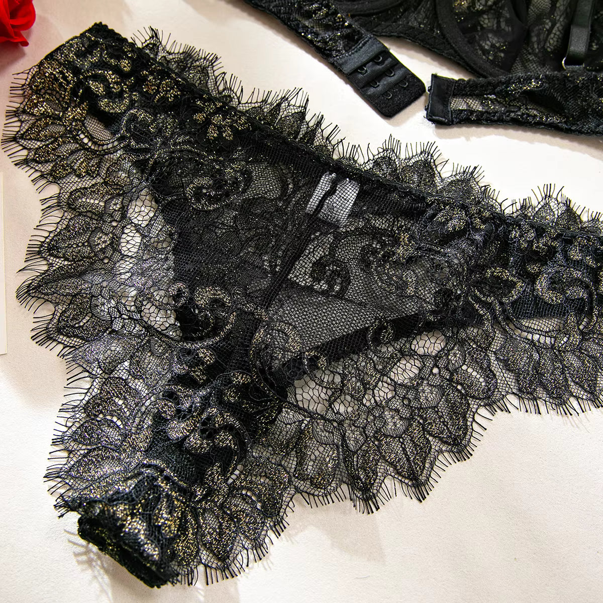 Women’s two-piece lingerie set featuring an eyelash lace bra and matching panty. Designed with delicate patchwork and sheer detailing for a refined, romantic Valentine look.
