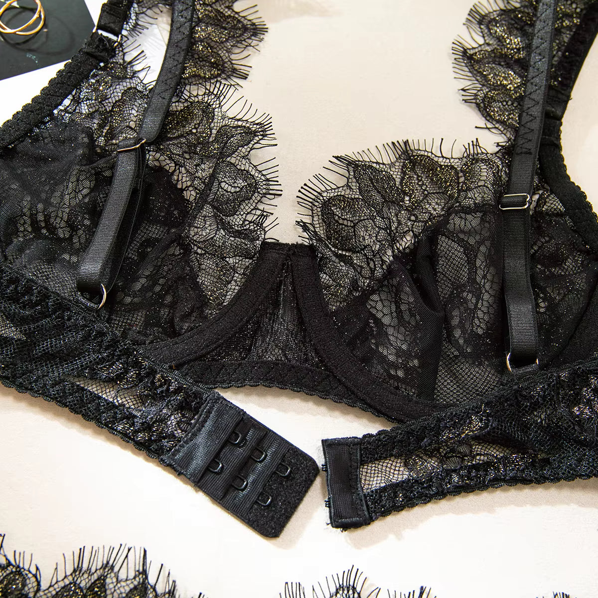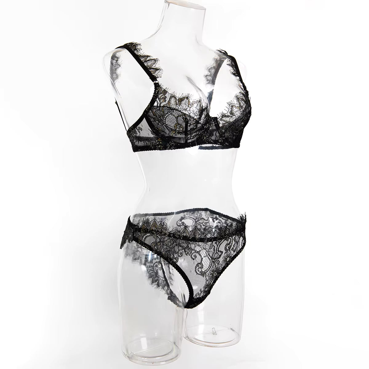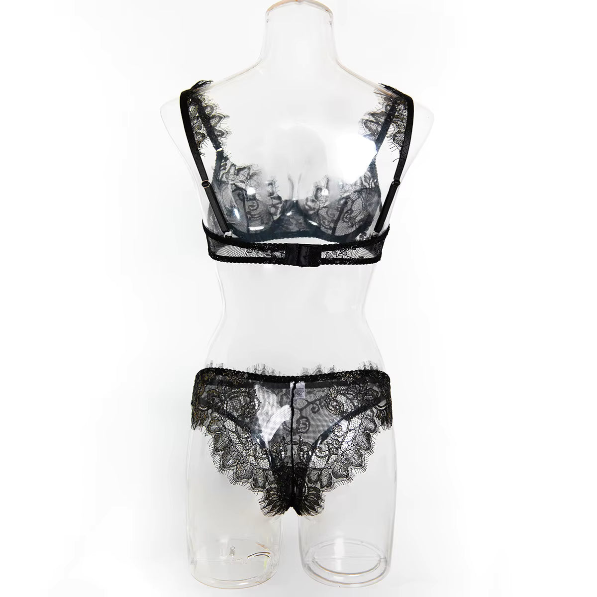 Women’s two-piece lingerie set featuring an eyelash lace bra and matching panty. Designed with delicate patchwork and sheer detailing for a refined, romantic Valentine look.