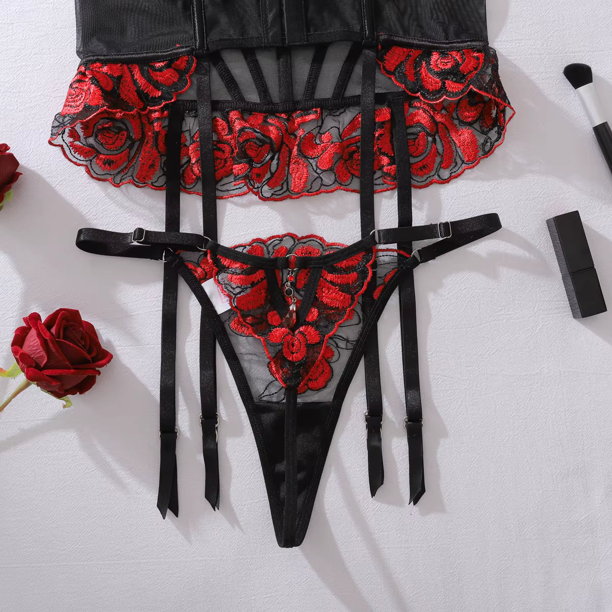 Romantic 2-piece Valentine lingerie set with tulle corset and thong. Floral embroidery, contrast colors and a refined Honey Rose design for a luxurious look.